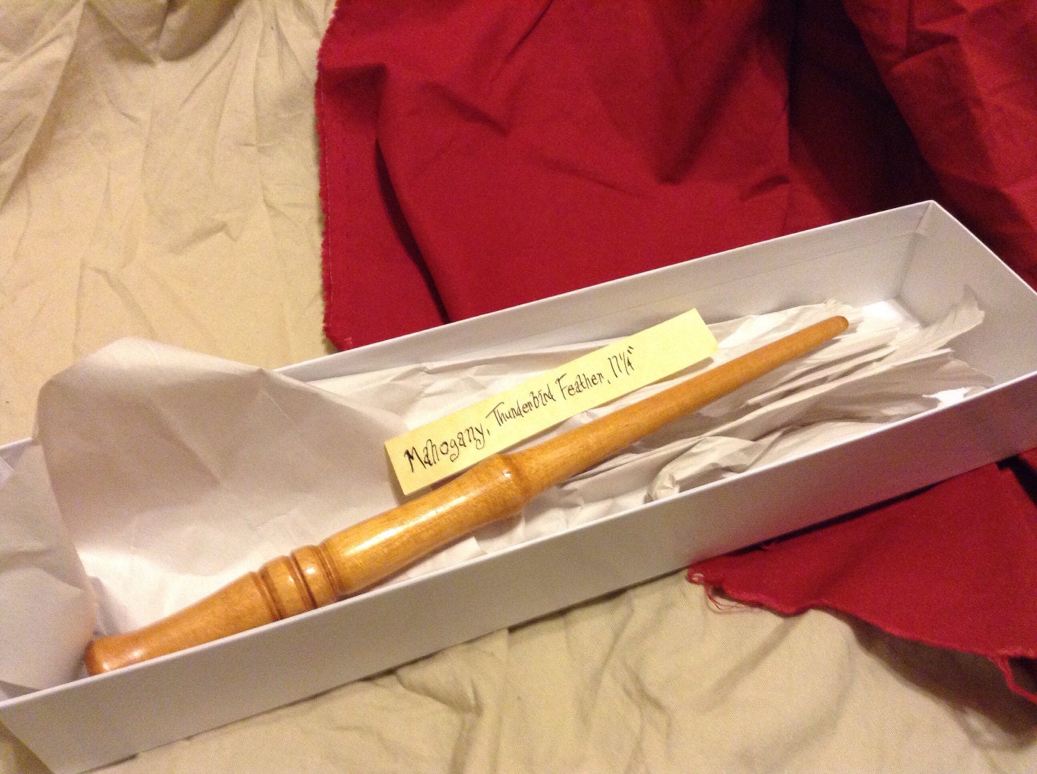 Individually crafted Mahogany wand for the Harry Potter and Fantastic beasts fan! Measuring 11 1/4", with a thunderbird feather core, this wand is ready for the witch or wizard in your life!